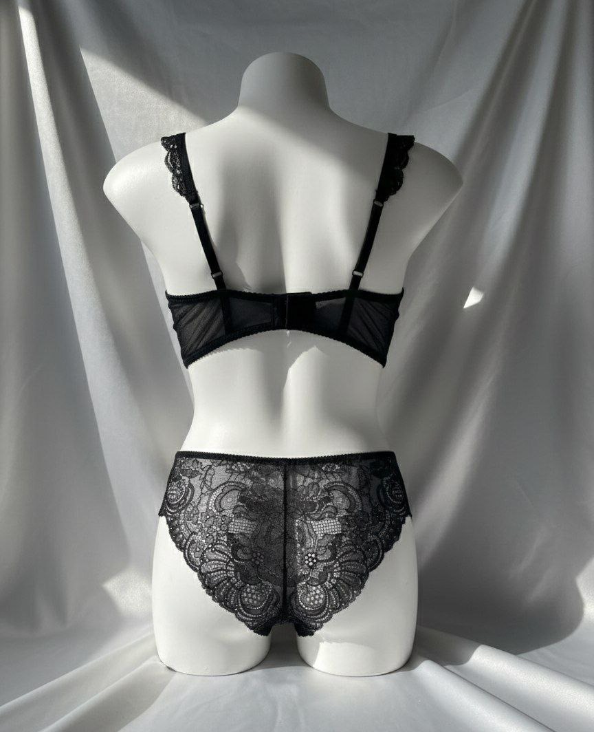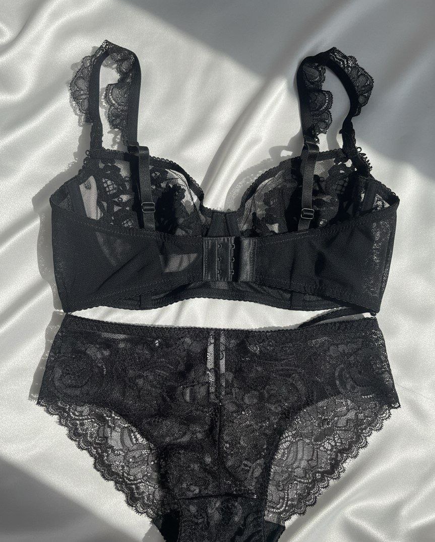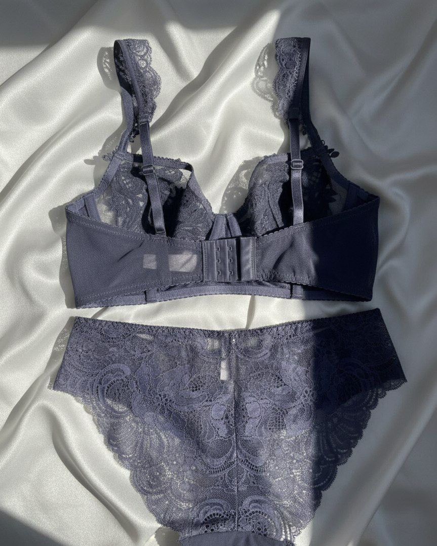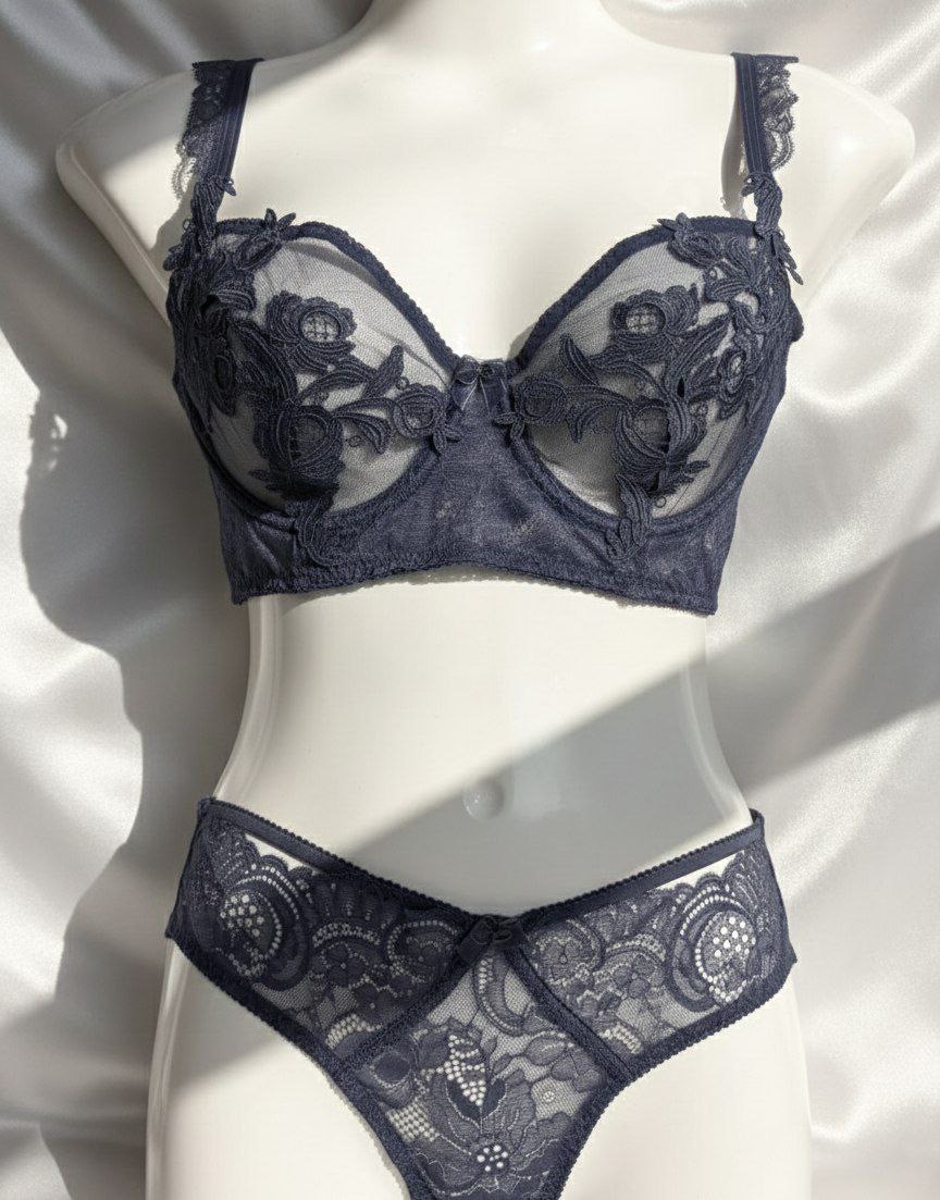 ست سوتین شورت تور دانتل طرح دار فانتزی در سه رنگ مشکی سورمه ای و صورتی که همه ی رنگ ها و سایز ها کاپ D هستند.