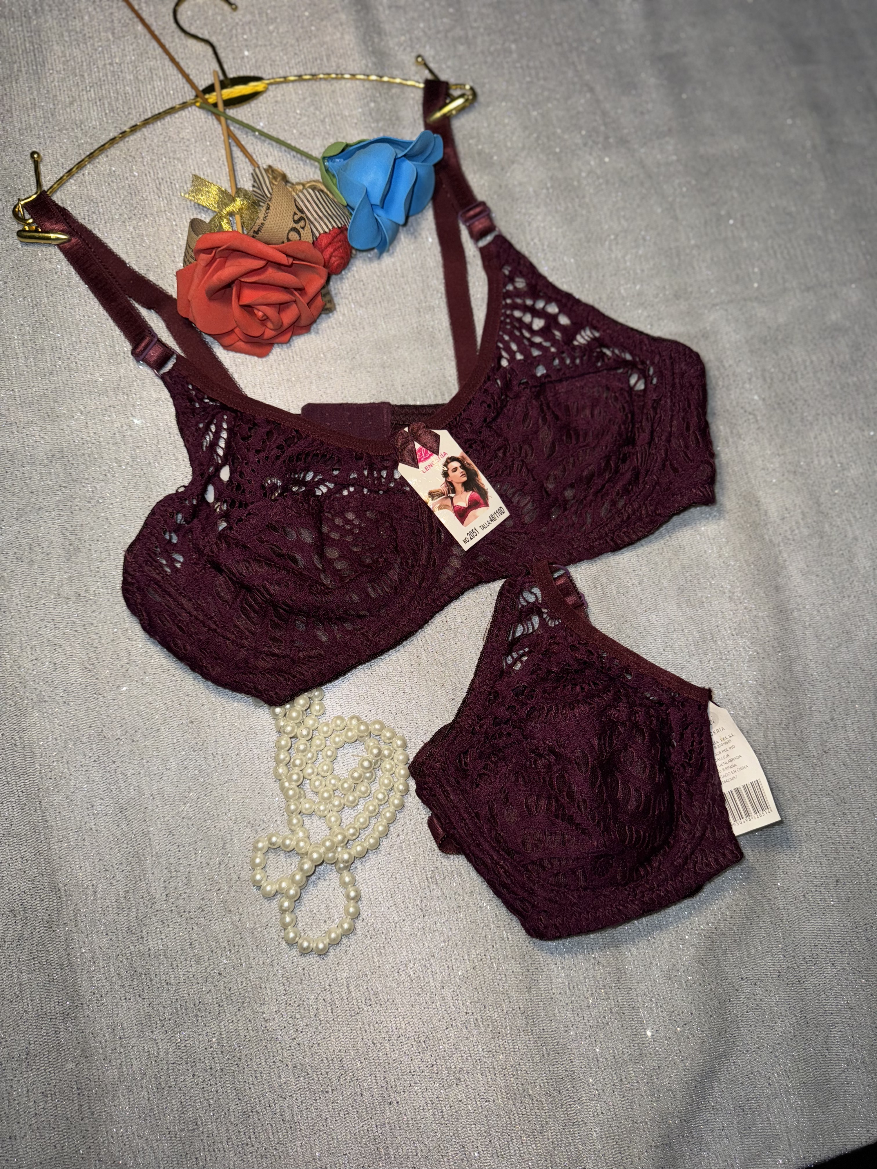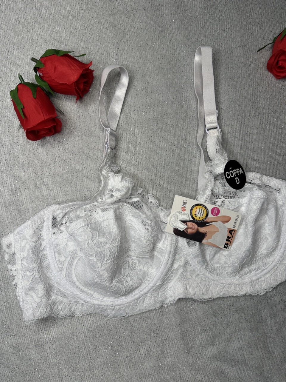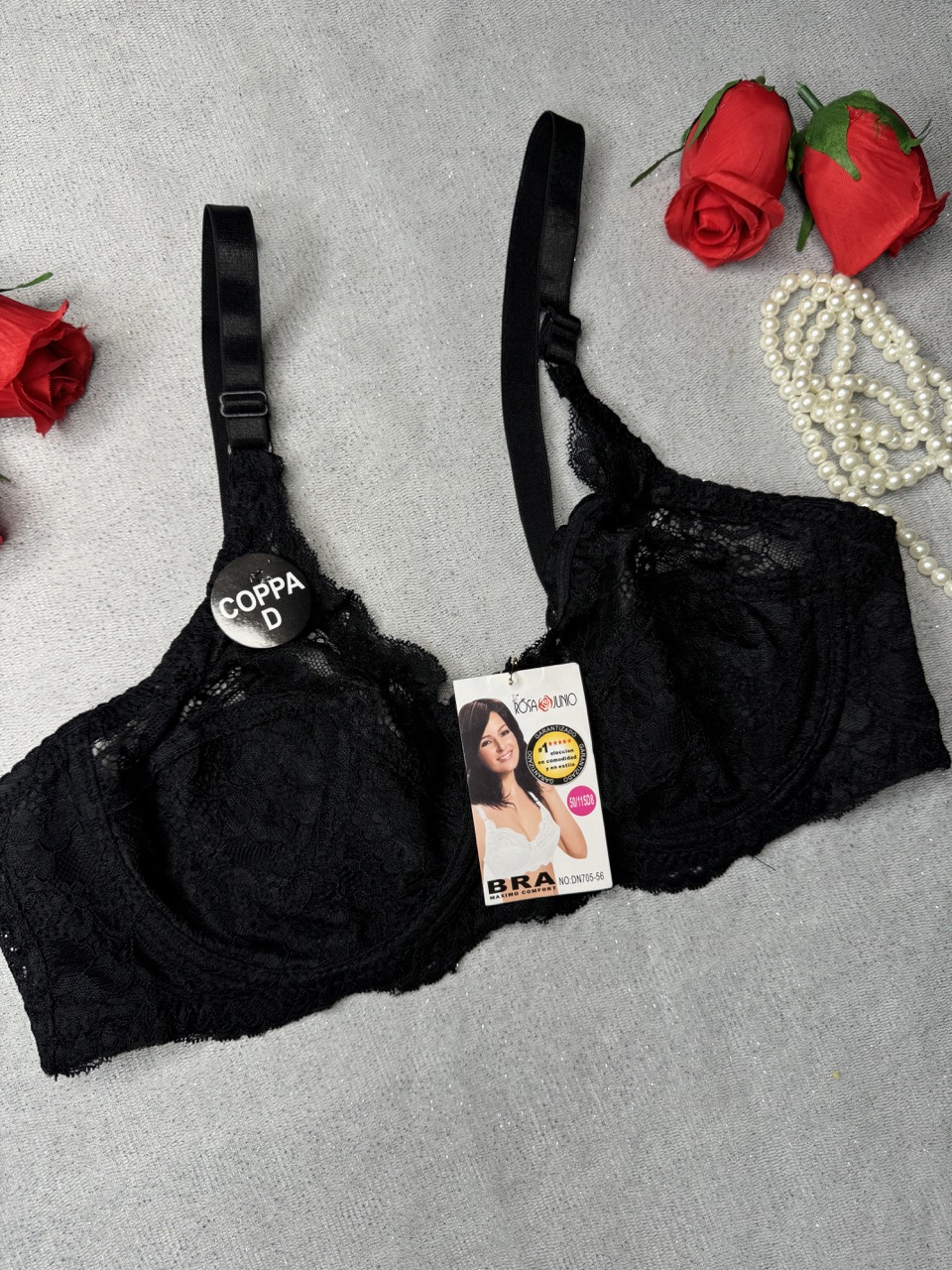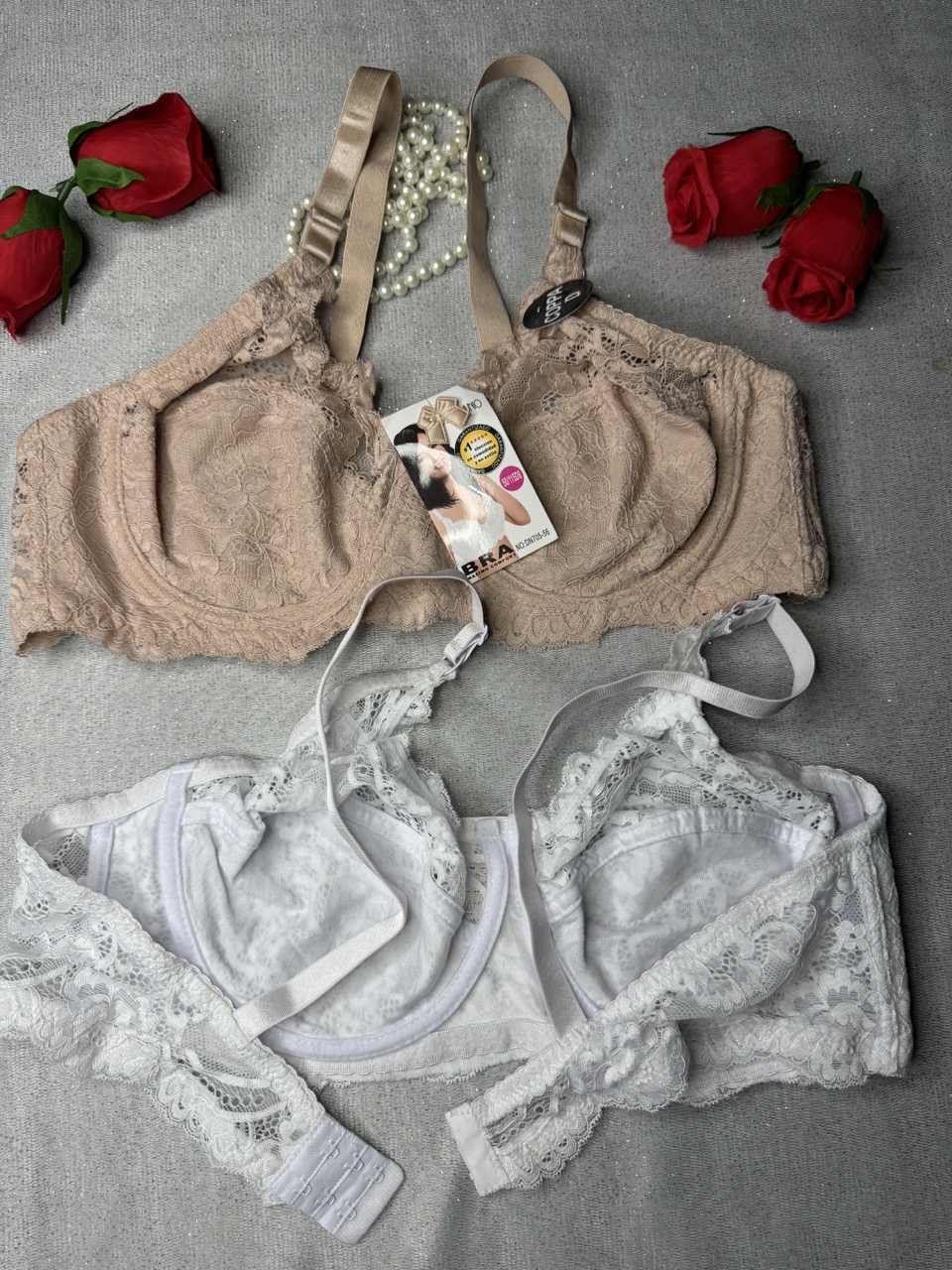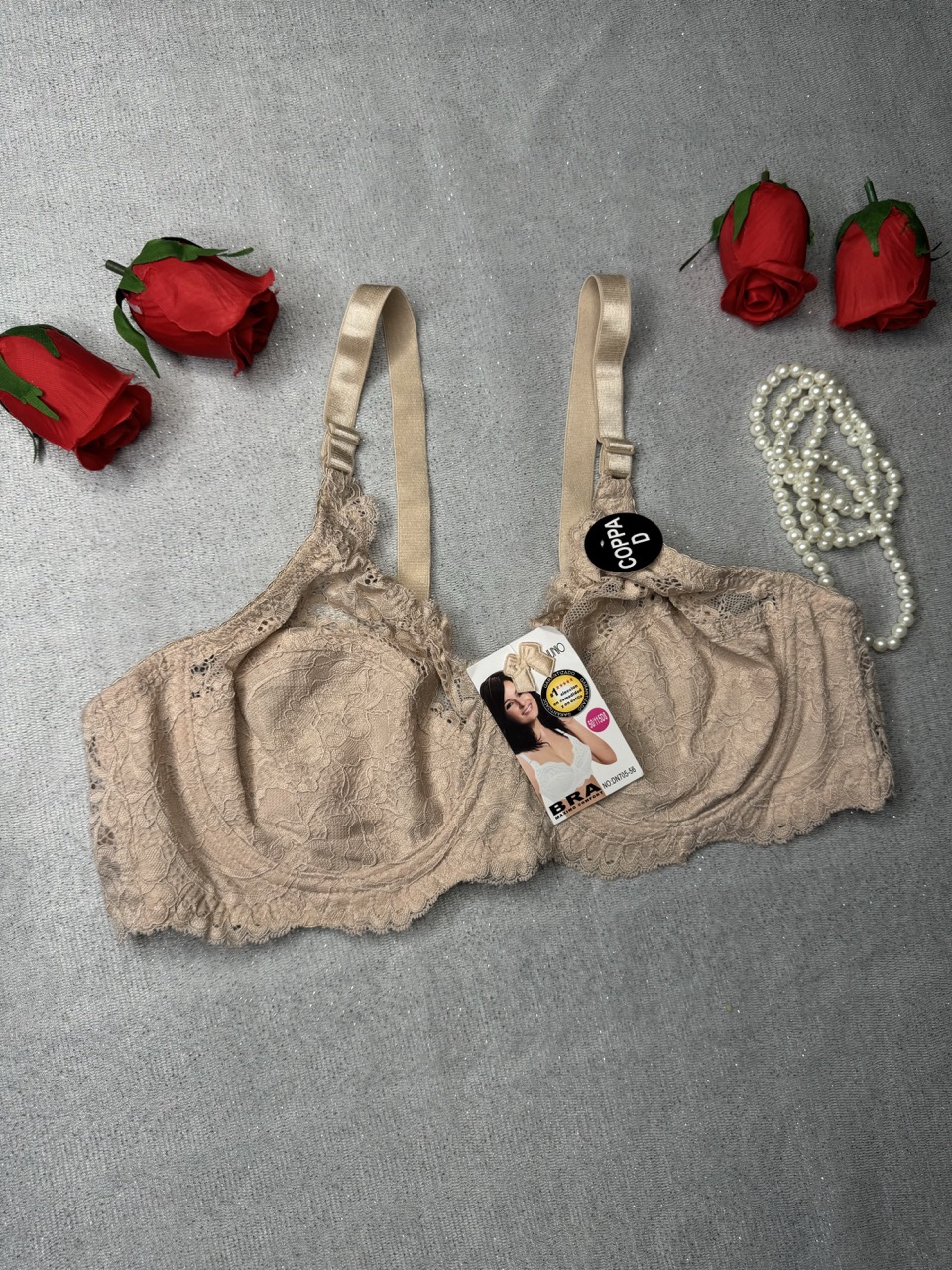 کاپ سوتین بهصورت نیمه طراحی شده؛ قسمت پایین از پارچه پوشیده برای جلوگیری از نمایانشدن، و قسمت بالایی از تور درشت و شفاف تشکیل شده که با طرح گل های بابون ریز جلوهای بسیار زیبا و زنانه به آن میدهد.